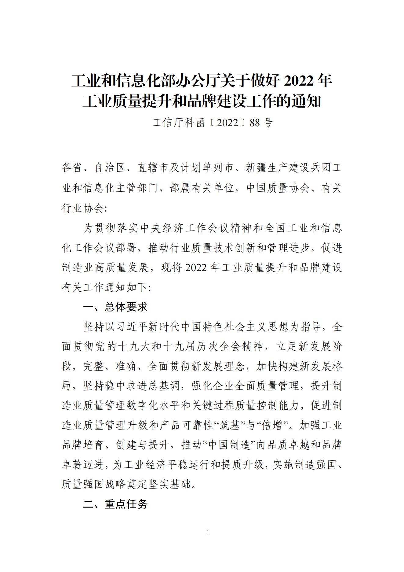 工业和信息化部办公厅印发《关于做好2022年工业质量提升和品牌建设工作的通知》