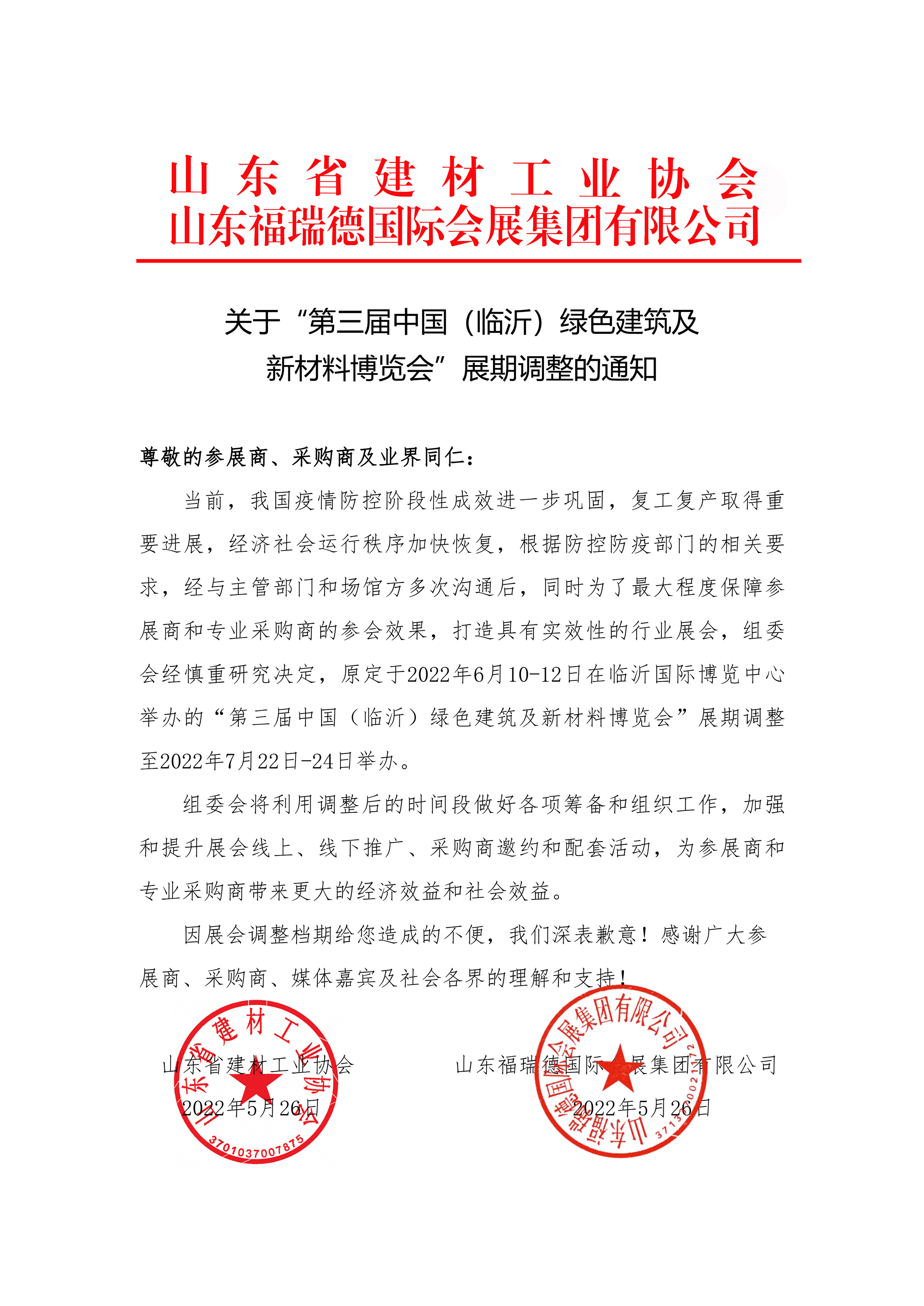 关于“第三届中国(临沂)绿色建筑及新材料博览会”展期调整的通知
