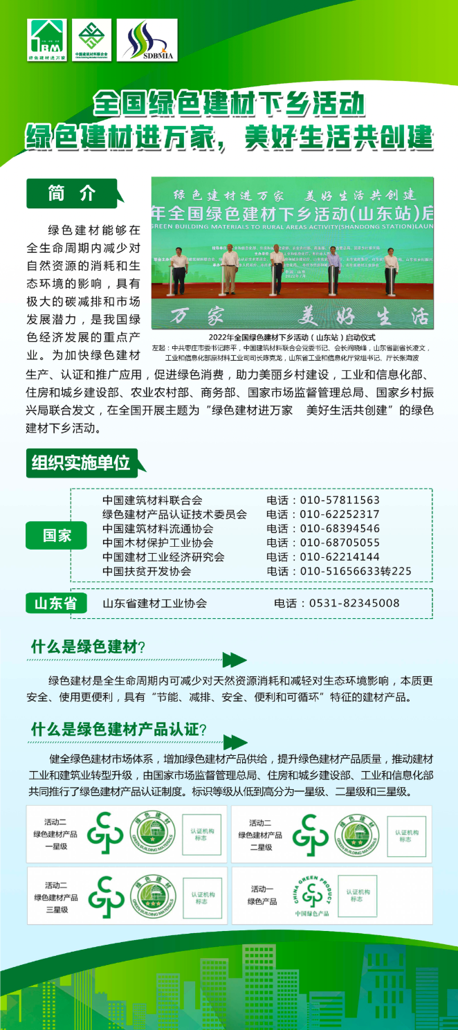 接下来山东省建材工业协会将会在工信厅的领导下与更多地市(区)积极对接,共同开展形式多样的推广活动,不断丰富绿色建材产品的种类、内涵和服务内容,构建起多层次的绿色建材推广体系,搭建促进绿色建材消费的线上、线下平台,实现上下游、产供销有效衔接,让更多、更好、更优惠的绿色建材产品服务消费者、服务美丽乡村、服务基层,促进绿色建材进万家,扮靓美好新生活。