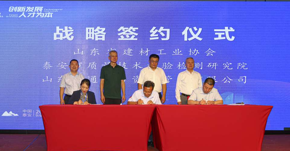 在与会嘉宾的共同见证下,山东省建材工业协会与泰安市质量技术检验检测研究院、山东倬通人力资源管理有限公司签署了战略合作协议。本次战略合作将依托泰安市质量技术检验检测研究院的检测资源和技术能力,山东倬通人力资源管理有限公司的培训资源和专业经验,面向全省建材企业在生产技术、企业管理、人才培养、产品质量等方面开展服务工作。逐步建立健全与企业生产经营相适应的,布局合理、专业齐全的服务与培训体系,有针对性地帮扶建材企业开展个性化服务。三方强强联合,将在未来的发展中密切合作、携手共进为建材行业发展提供强有力的技术支撑。