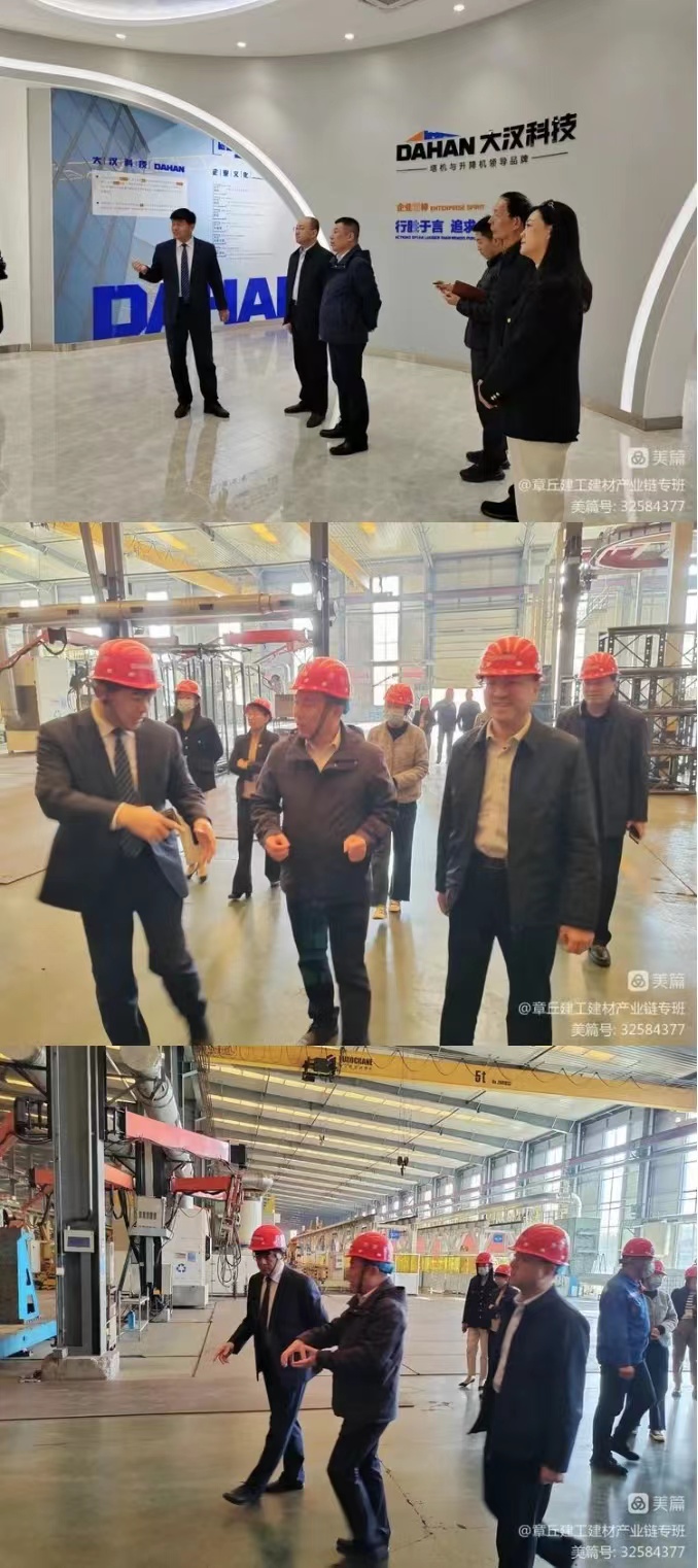 在大汉科技股份有限公司董事长康与宙、总经理张茹的陪同下,参观了公司展厅和智能工厂生产情况,现场察看了塔机自动化焊接生产线、升降机标准节自动焊接生产线、塔机电泳涂装生产线等企业现代化智能生产系统,就企业市场拓展、外经外贸、科技研发、发展方向等进行了深入探讨。