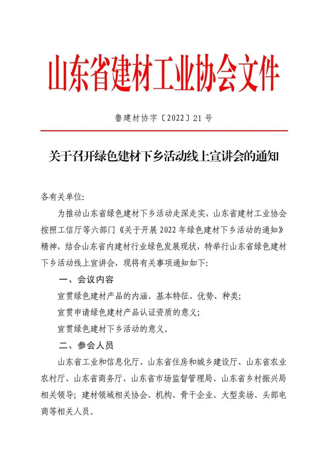 山东省建材工业协会关于召开绿色建材下乡活动线上宣讲会的通知