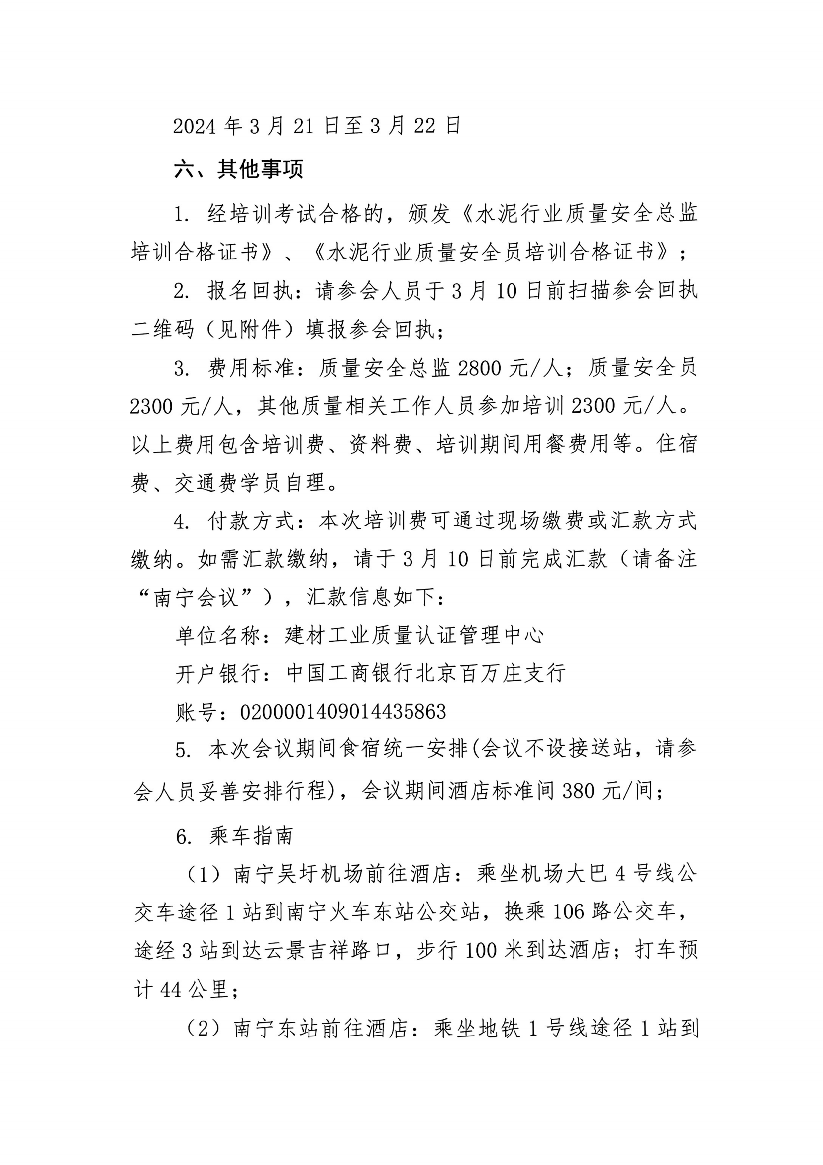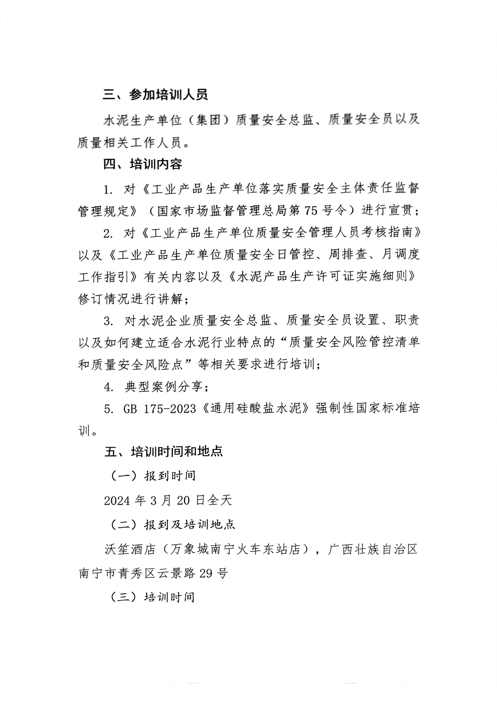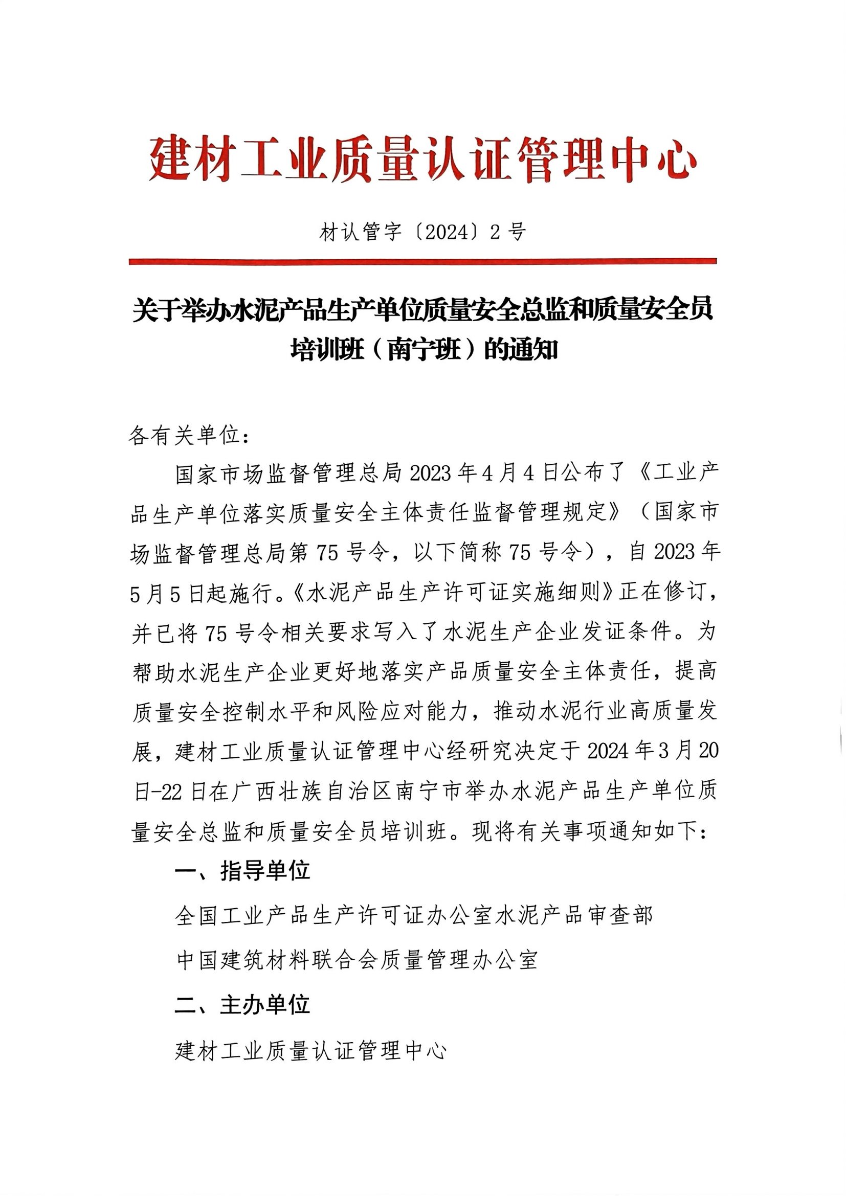建材工业质量认证管理中心关于举办水泥产品生产单位质量安全总监和质量安全员培训班(南宁班)的通知