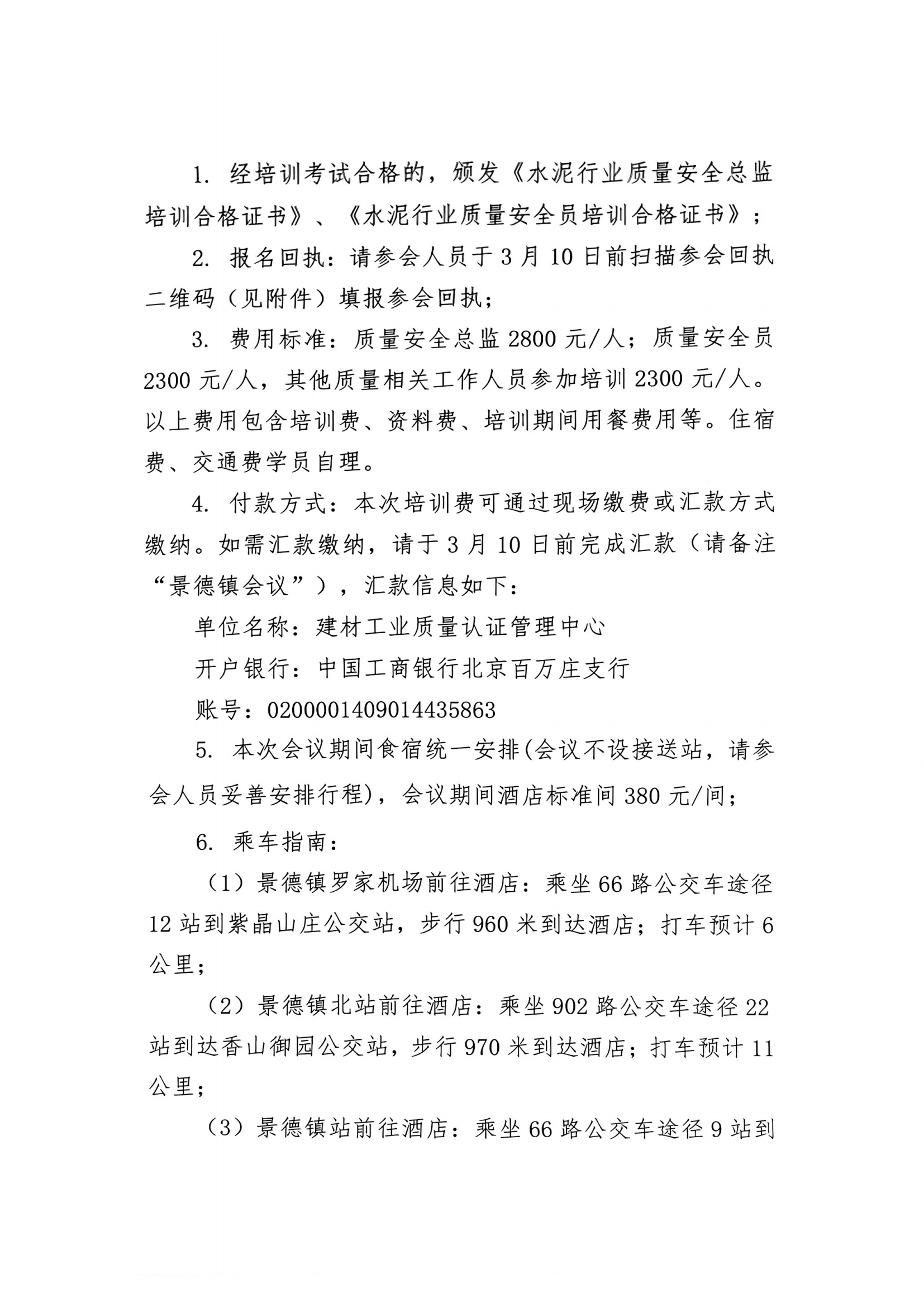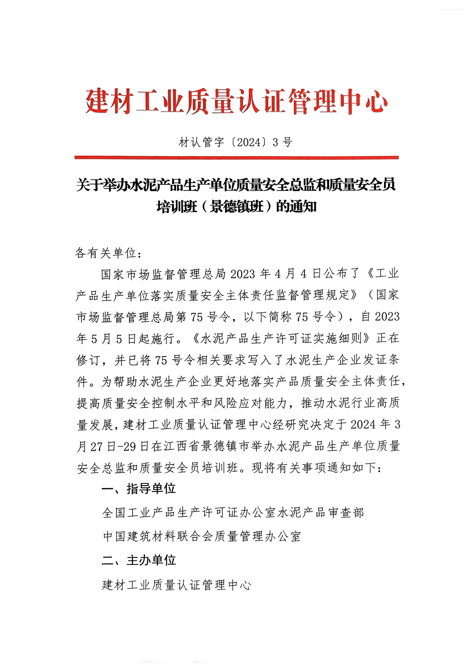 建材工业质量认证管理中心关于举办水泥产品生产单位质量安全总监和质量安全员培训班(景德镇班)的通知