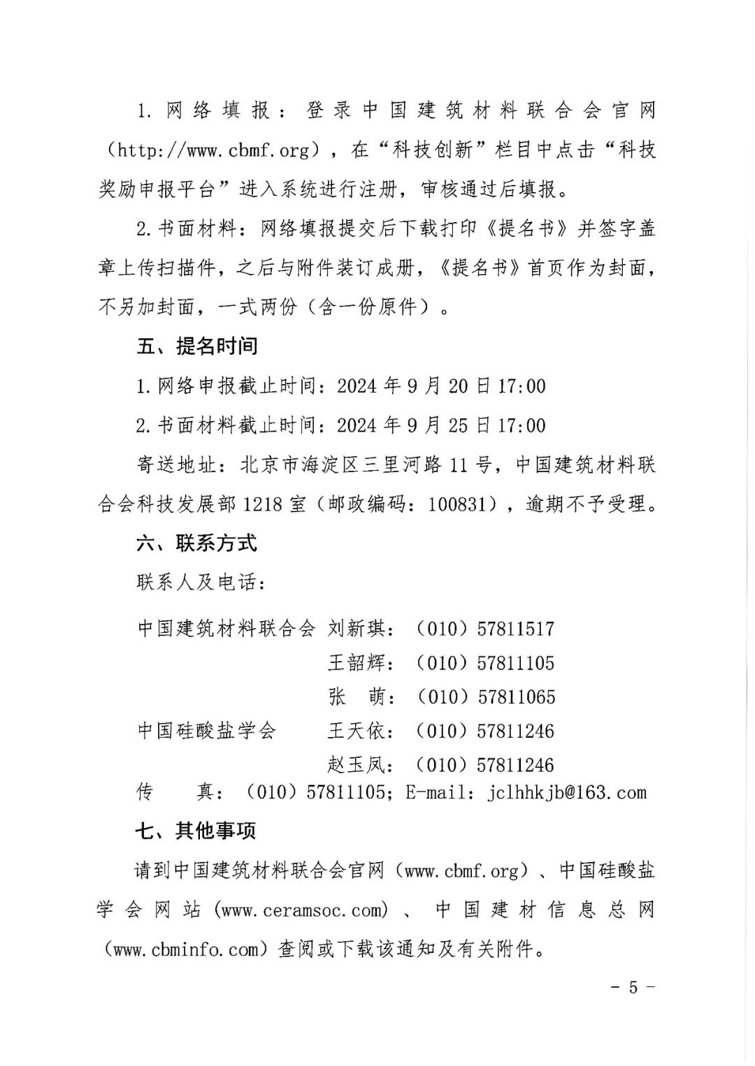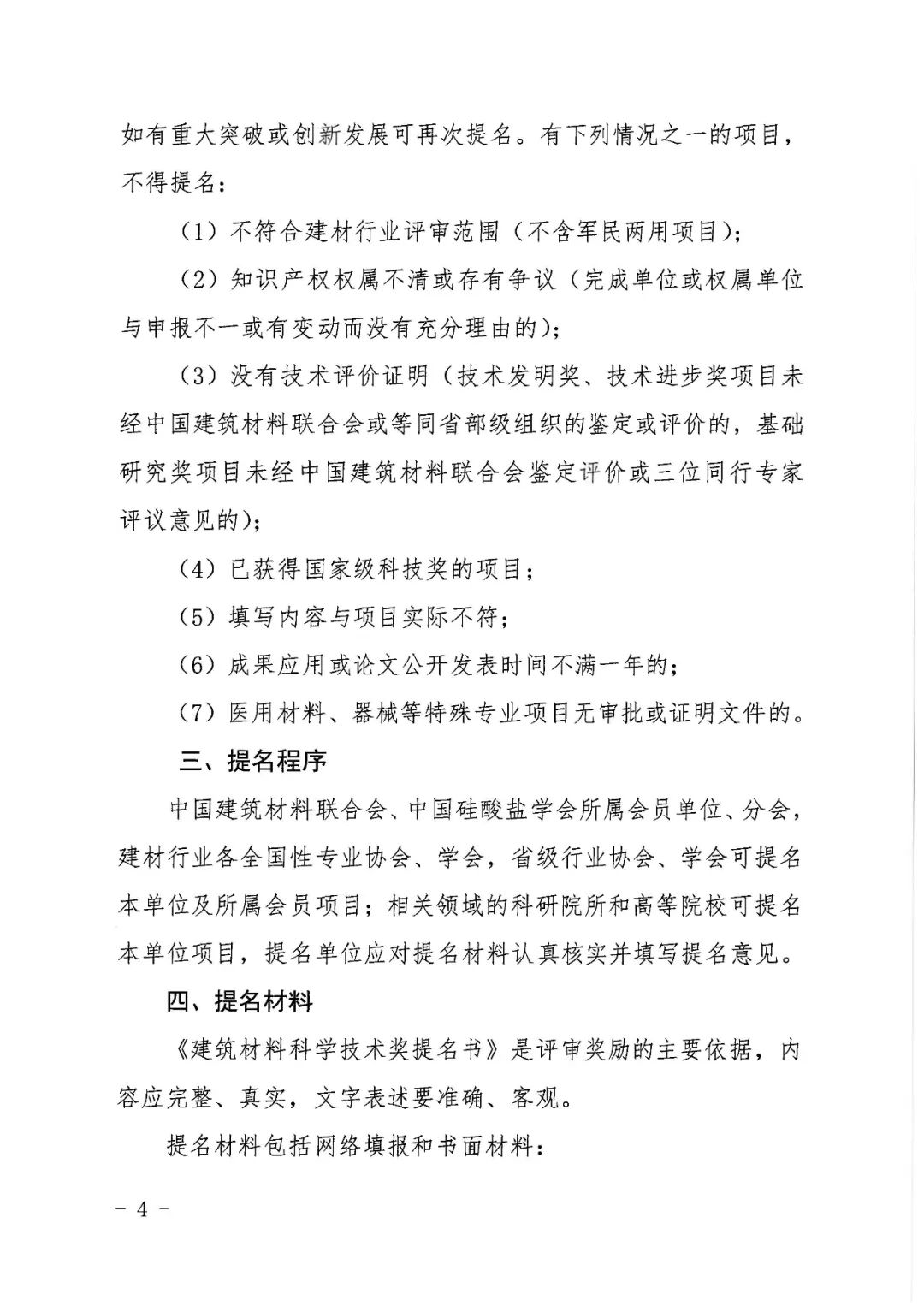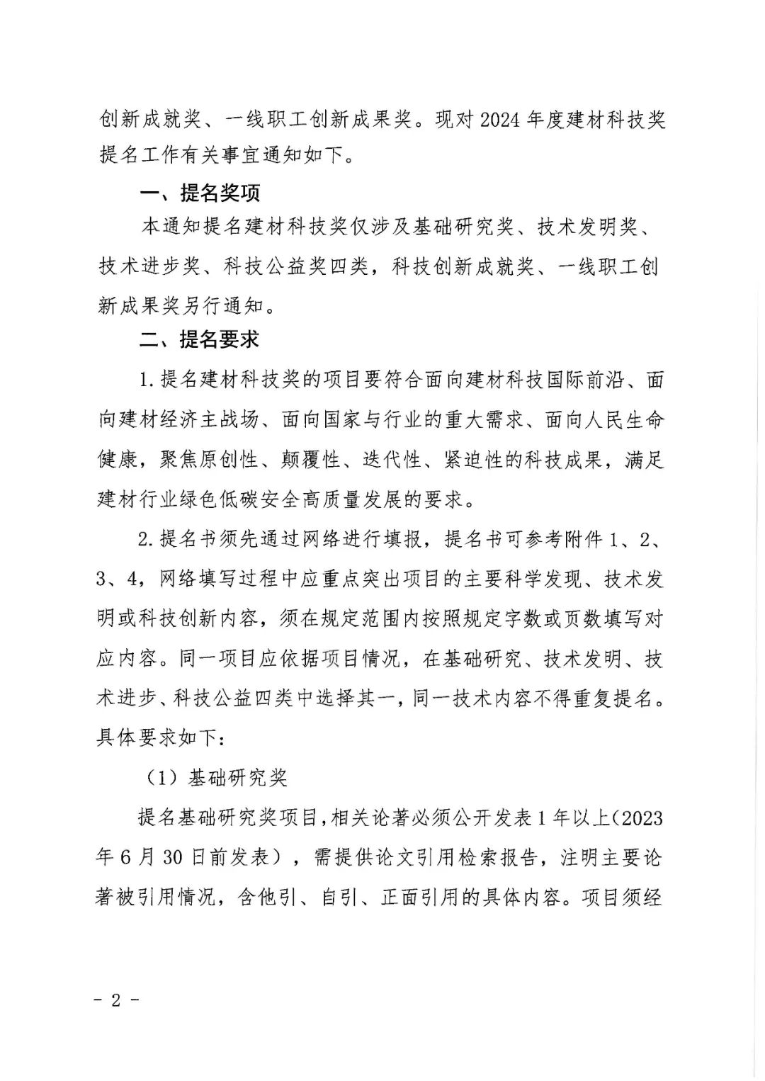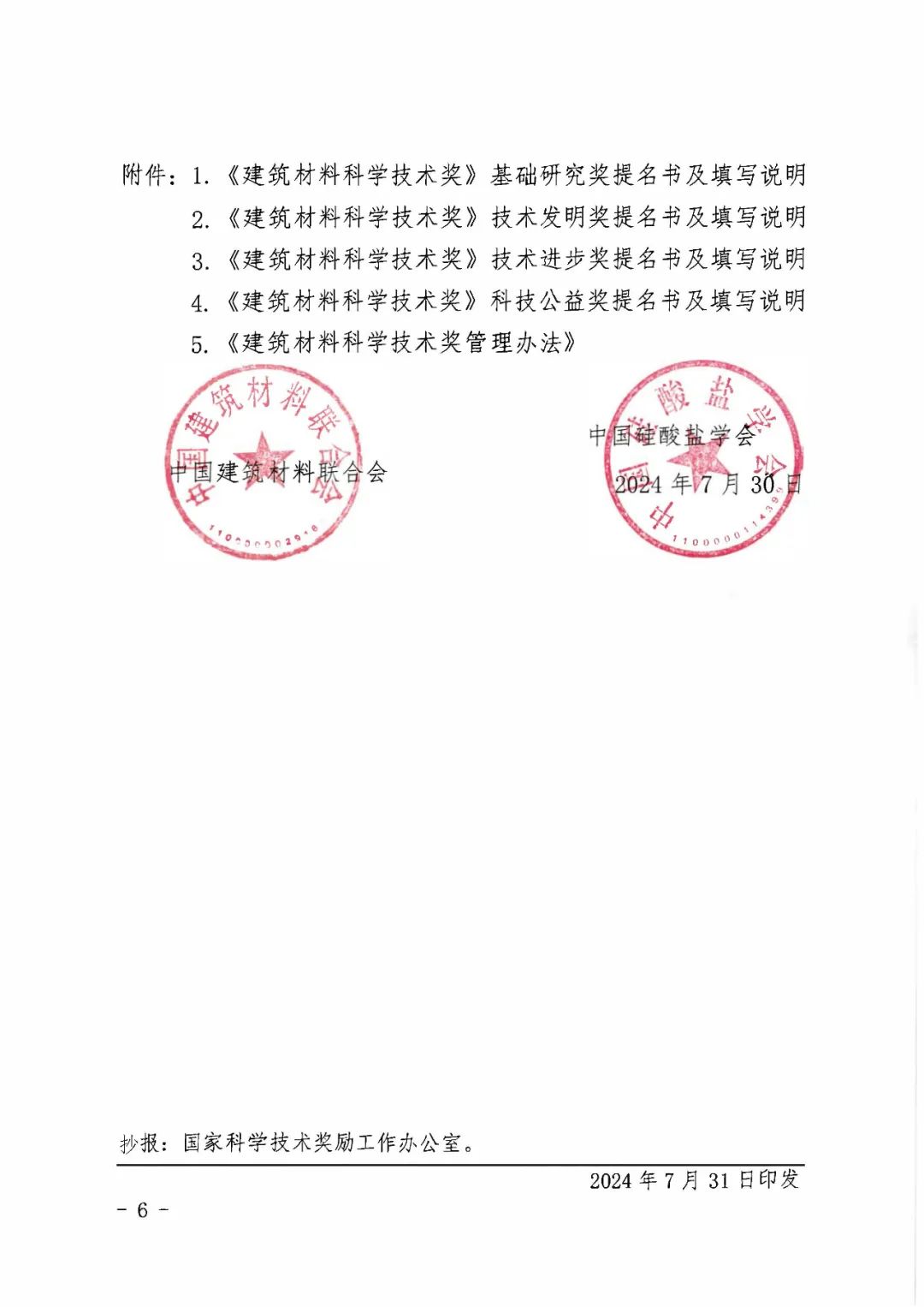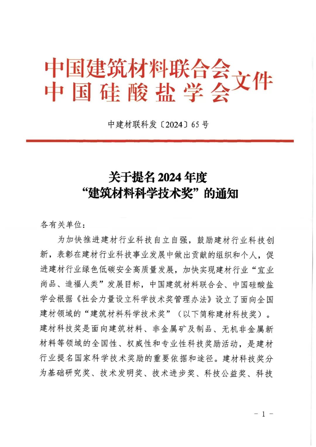 中国建筑材料联合会 中国硅酸盐学会关于提名2024年度“建筑材料科学技术奖”的通知