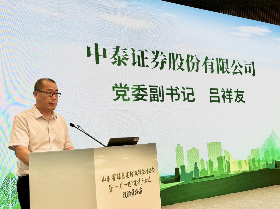 吕祥友表示,中泰证券以建设忠诚、合规、创新、美美与共的一流证券公司为抓手,扛牢服务实体经济主责主业,致力于为全省经济社会发展提供高质量金融服务。中泰证券子公司齐鲁股权交易中心,认真贯彻落实省委、省政府“高标准建设‘专精特新’专板,打造国内一流区域性股权市场”的工作要求,聚焦“规范培育、助企上市”功能,聚力培育优质中小企业,累计挂牌企业超过6000家,帮助企业实现各类融资1400亿元。今年以来,齐鲁股交按照省工业和信息化厅部署要求,积极协助举办全省“一月一链”投融资路演活动,服务企业3200 余家次,达成融资意向超过 190 亿元,进一步拓宽了专精特新企业融资渠道。下一步,中泰证券将在省工业和信息化厅、省财政厅、省住房和城乡建设厅等单位的指导下,牢记服务实体经济根本宗旨,发挥好齐鲁股交 “专精特新”专板的企业培育优势,持续为建材产业链企业提供能感知、有温度、见效果的综合金融服务,为我省建材产业绿色低碳高质量发展贡献中泰力量。