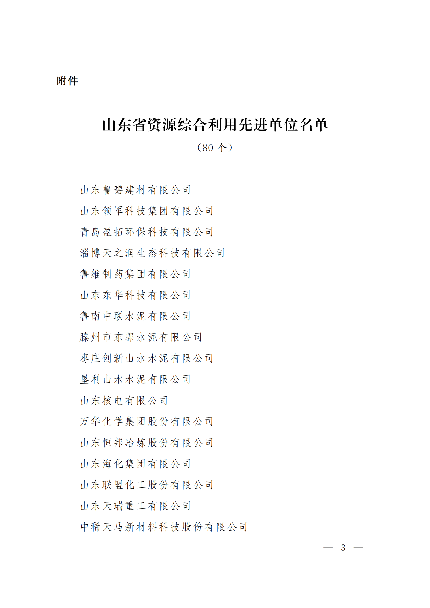 近年来,面对经济发展新形势、新要求,全省各级、各部门和广大企业深入学习贯彻习近平新时代中国特色社会主义思想,坚定拥护“两个确立”、坚决做到“两个维护”,全面贯彻习近平总书记对山东工作的重要指示要求,完整、准确、全面贯彻新发展理念,切实把加强资源综合利用作为加快推动新旧动能转换、促进经济社会绿色低碳高质量发展的重要举措,全省资源综合利用工作迈上了一个新的台阶,涌现出一批先进典型。为鼓励先进,推动资源综合利用工作再上新水平,省政府决定,授予山东鲁碧建材有限公司等80个单位“山东省资源综合利用先进单位”称号。