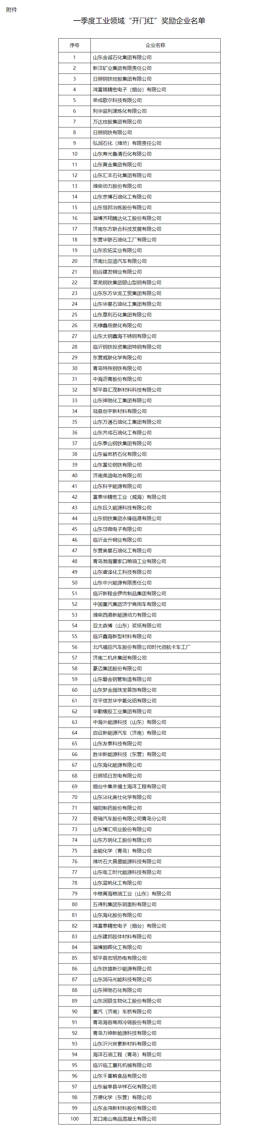为贯彻落实省委、省政府关于加力提速工业经济高质量发展的工作部署,根据《山东省人民政府印发关于促进经济加快恢复发展的若干政策措施暨2023年“稳中向好、进中提质”政策清单(第二批)的通知》(鲁政发〔2023〕1号)有关要求,省工业和信息化厅、省财政厅联合开展了一季度工业领域“开门红”奖励评选工作,确定了奖励企业名单。经省委、省政府同意,现予以公布,对100家企业分档给予资金奖励。各市要组织获奖企业再接再厉高效生产,努力实现全年“稳进提质”,引导更多企业学习先进、提升质效,推动工业经济加力提速高质量发展。