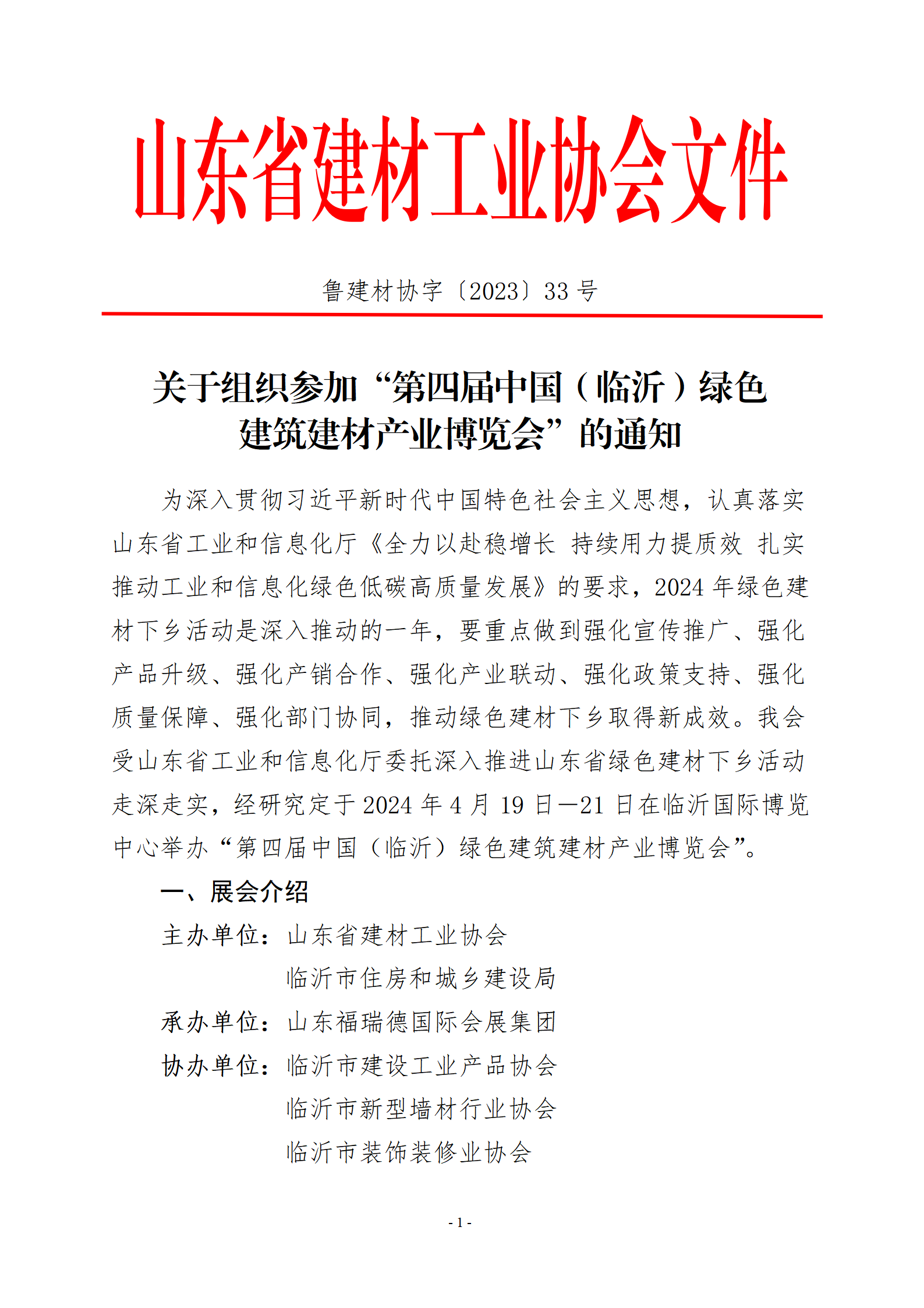 山东省建材工业协会关于组织参加“第四届中国(临沂)绿色建筑建材产业博览会”的通知