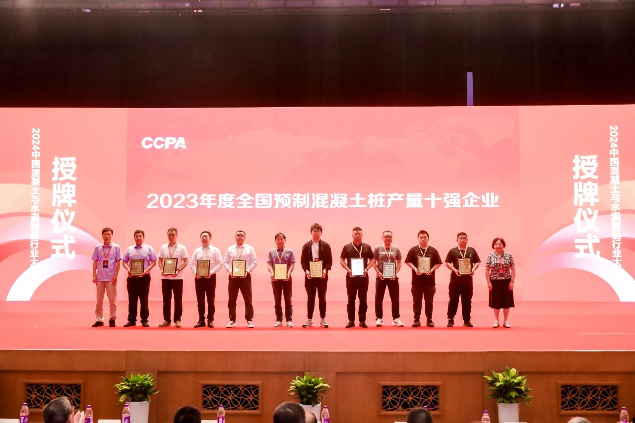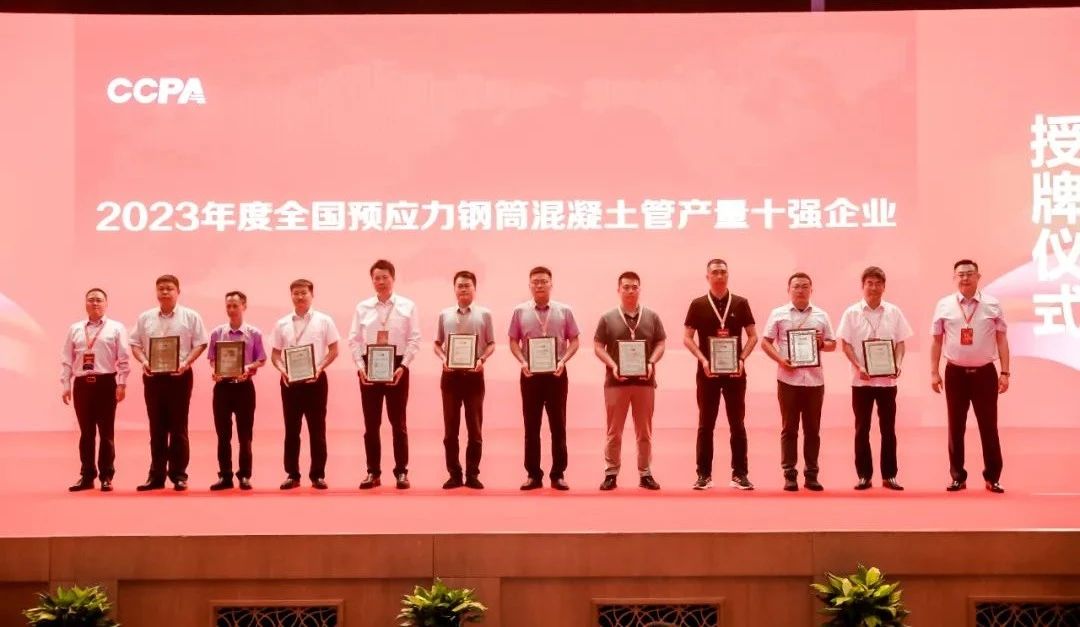 中国混凝土与水泥制品协会秘书处在对预拌混凝土、预制混凝土构件、预制混凝土桩、预应力钢筒混凝土管四个行业重点企业进行调研和统计分析的基础上,以产量为基础发布了2023年度十强企业名单,并进行授牌。其中我会理事单位获奖企业有山东龙泉管业股份有限公司、中国电建集团山东电力管道有限公司、山东禹王管业有限公司、青岛中禹管业有限公司、山东沃特管业股份有限公司。