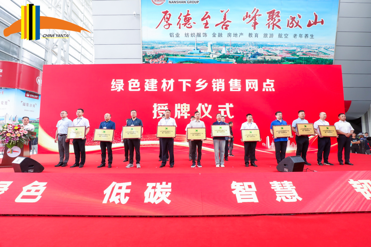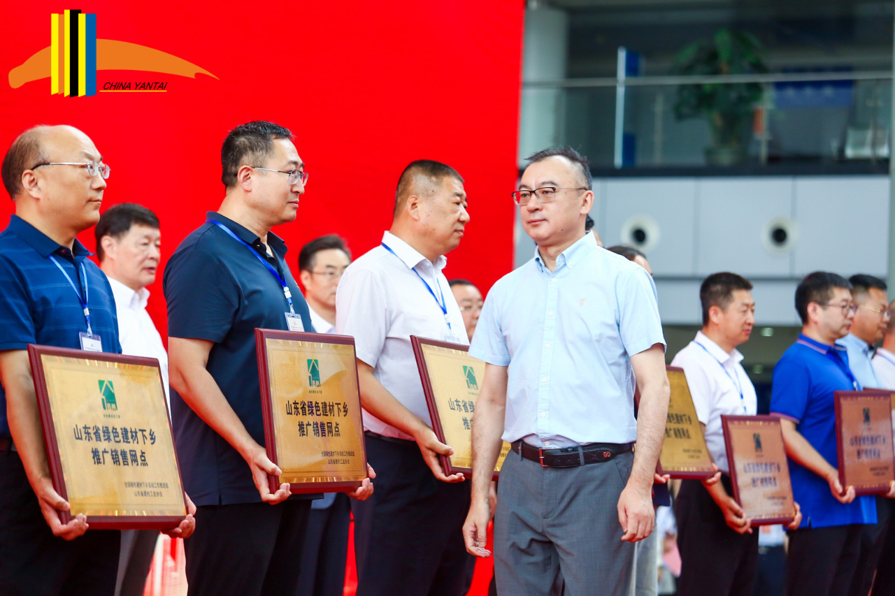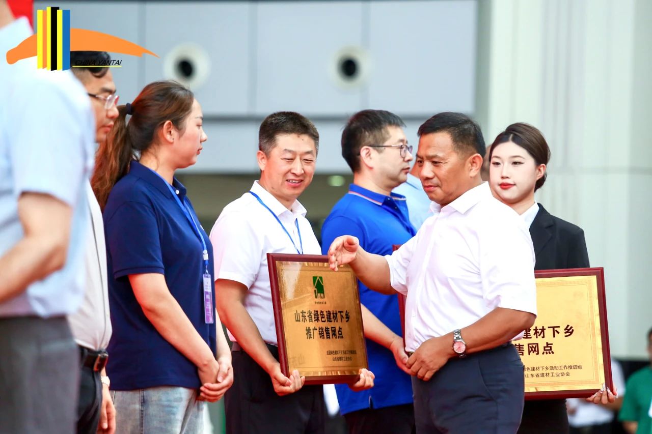 山东省建材工业协会会长李荣金与山东省房地产业协会常务副会长李斌共同为烟台嘉阳乐天家居有限公司等10家“山东省绿色建材下乡推广销售网点”授牌。