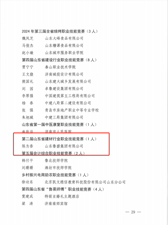 近日,山东省人力资源和社会保障厅下发了《关于公布2024年度“山东省技术能手”名单的通知》,其中,由我会主办的2024年山东省“技能兴鲁”职业技能大赛——第二届山东省建材行业职业技能竞赛中山东鲁碧集团有限公司的陈为香表现突出,被授予“山东省技术能手”称号。
