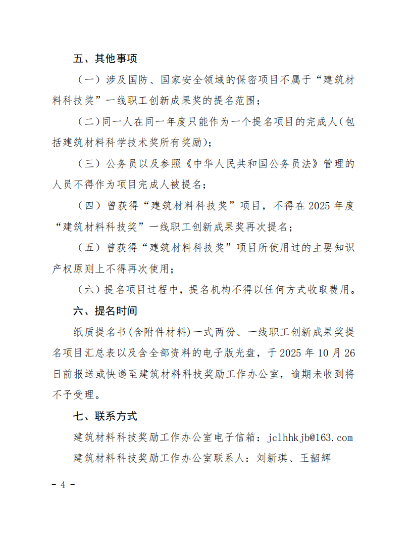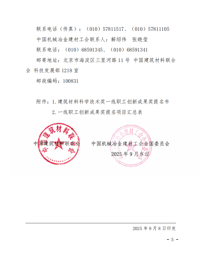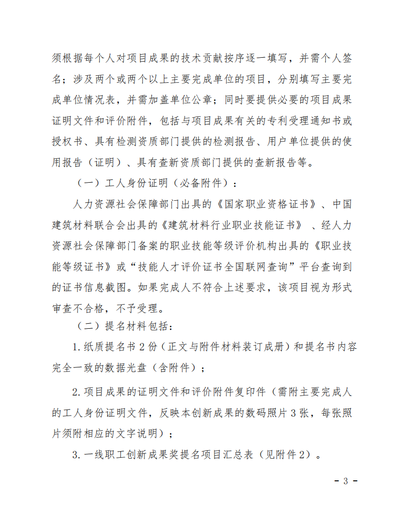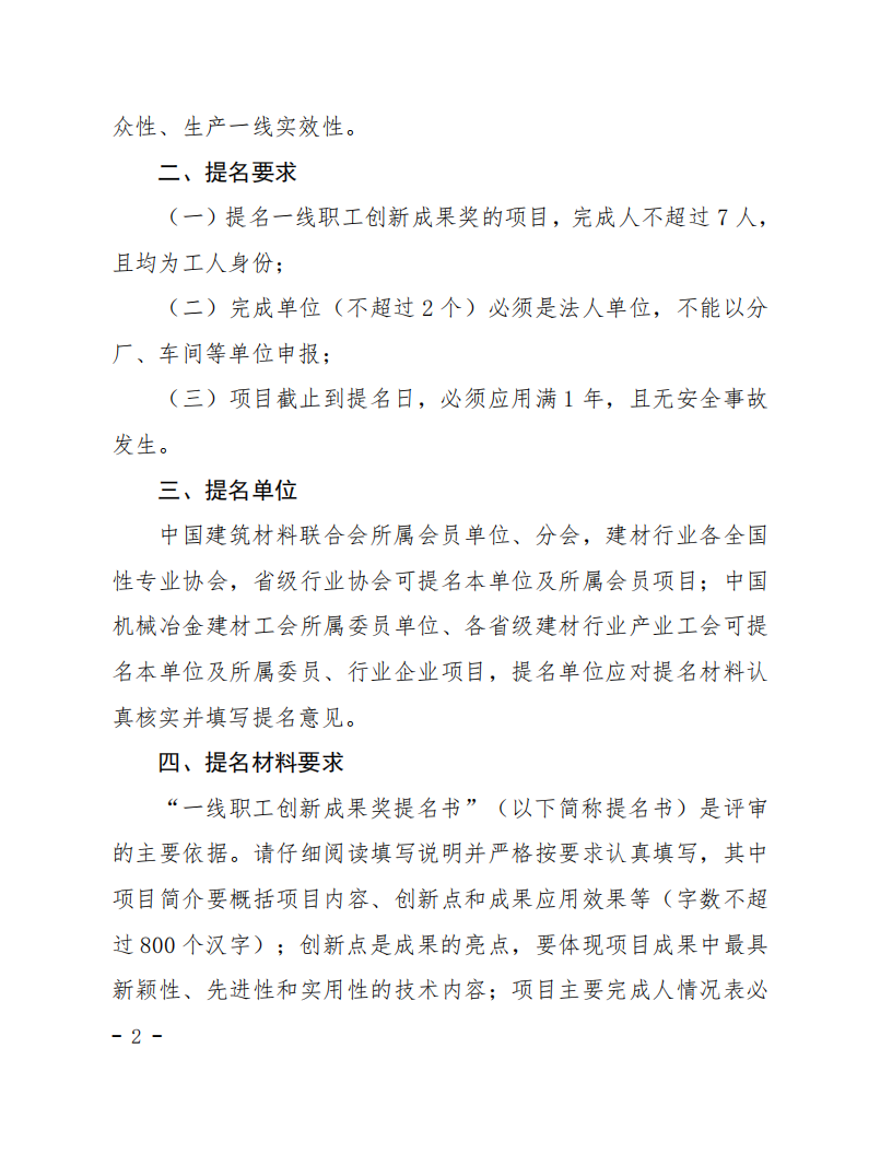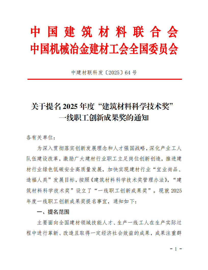 中国建筑材料联合会关于提名 2025 年度“建筑材料科学技术奖”一线职工创新成果奖的通知
